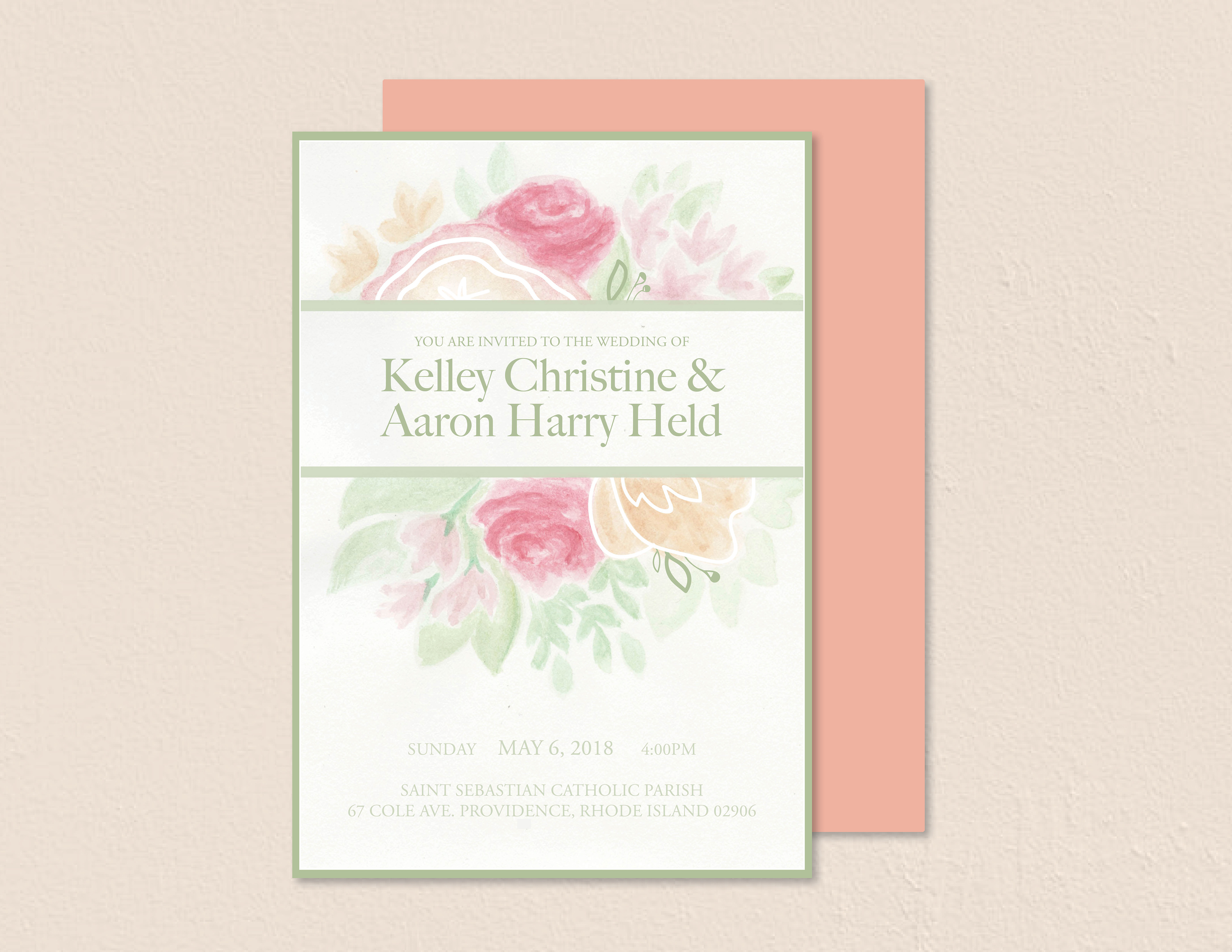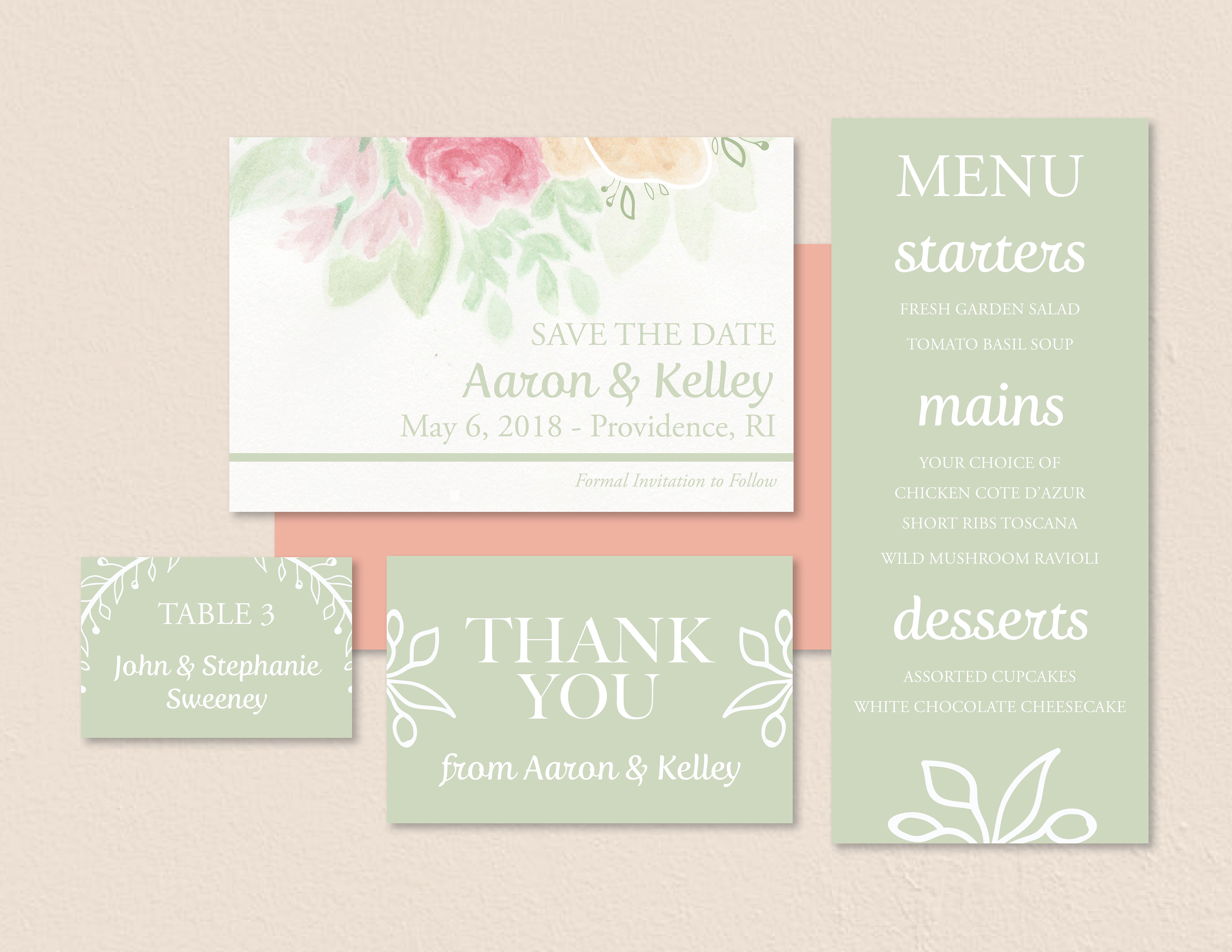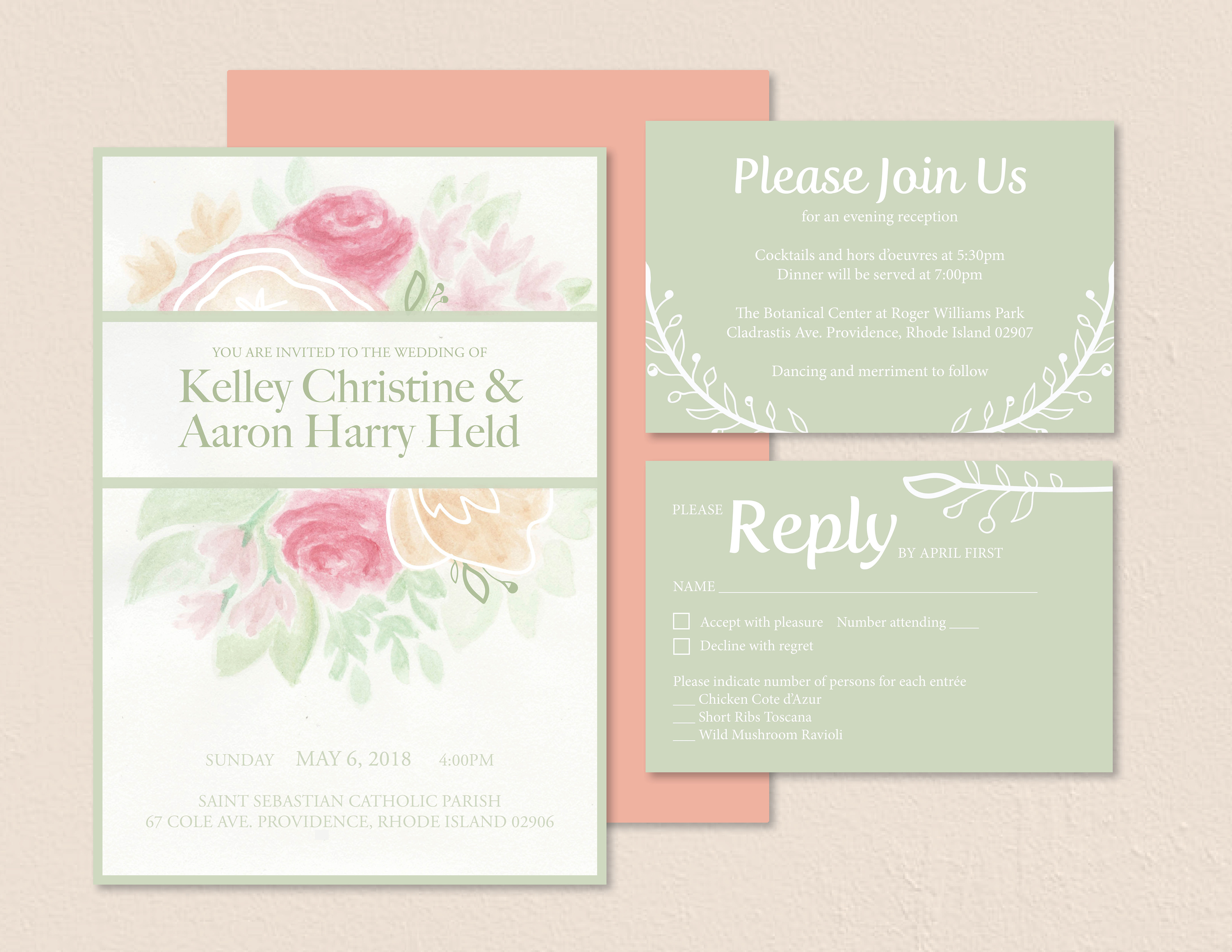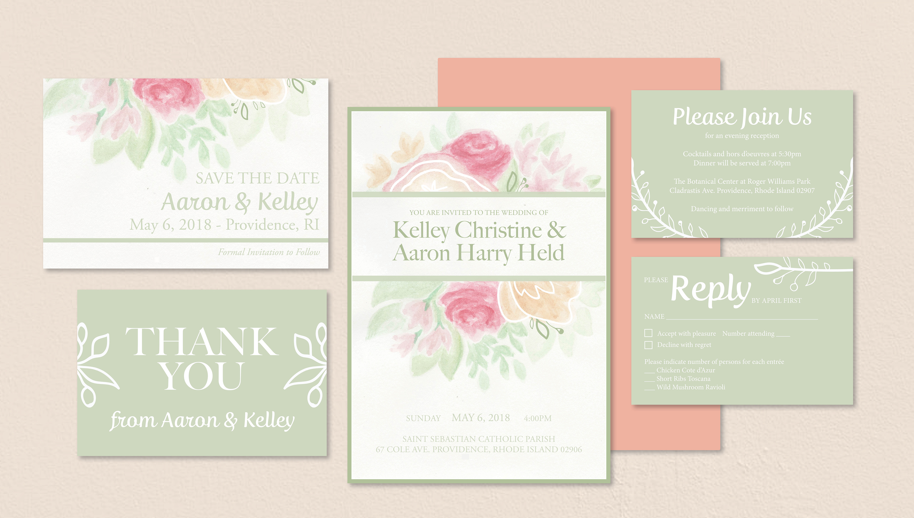 Wedding invitations and cards designed for Kelley and Aaron. Created using hand-painted watercolor backgrounds.